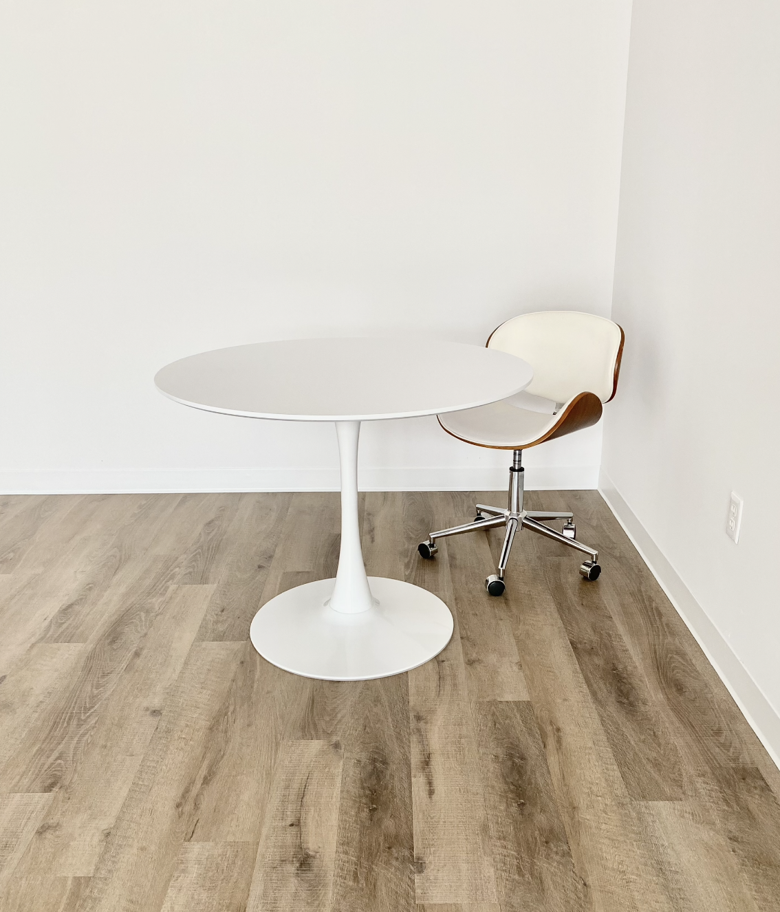 Included furniture: Full length mirror, round table with black chairs, clothing rack, and floor plant.